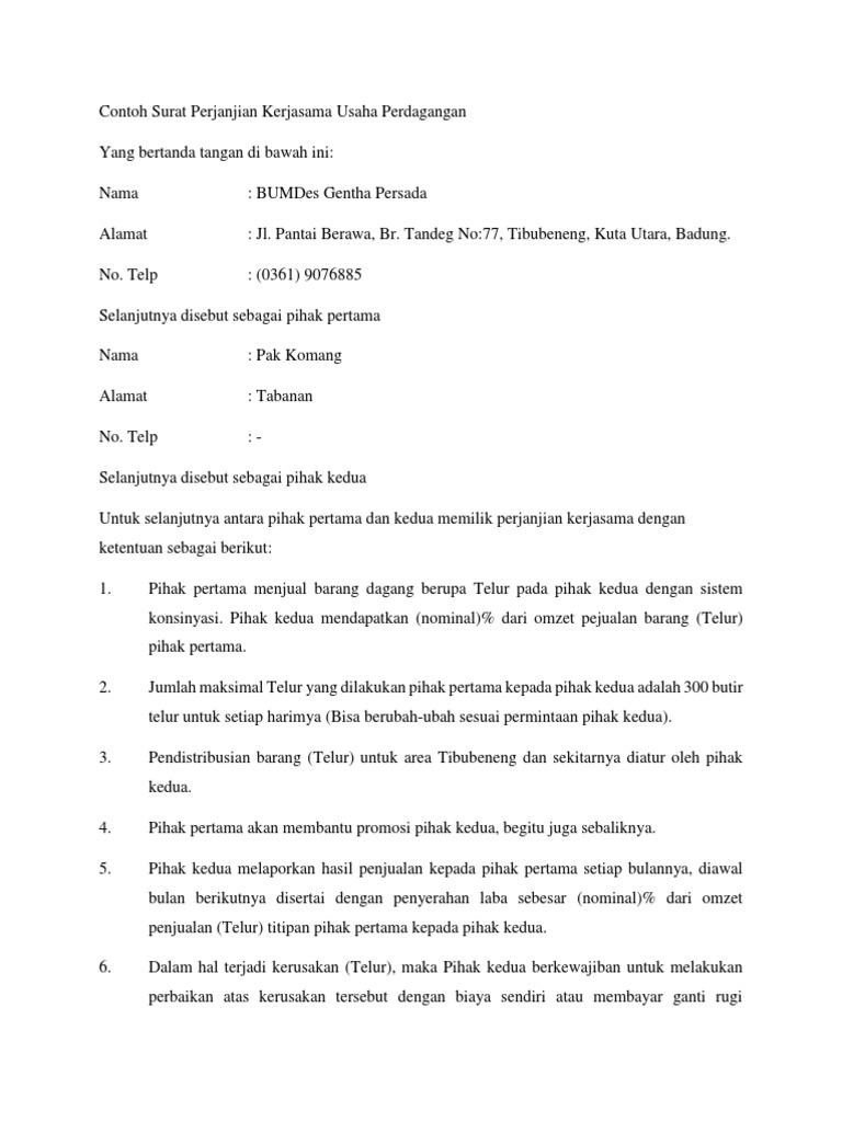 Kontrak Kerjasama Bisnis - Surat Perjanjian Formulir Hasil ... from cdn3.f-cdn.com Contoh surat perjanjian kerjasama investasi modal usaha ini digunakan sebagai keterangan dan pengikat dua belah pihak. Surat perjanjian kerjasama para pihak yang bertanda tangan di bawah ini: Savesave kontrak kerjasama modal usaha for later. Tinjauan aspek komersial kontrak migas (grasindo 2012). Nota ini dibuat sebagai langkah awal dalam membuat kontrak kerjasama perjanjian untuk mengikan kedua pihak yang bekerjasama. Surat perjanjian kontrak kerja semua perusahaan pada dasarnya sama karena di indonesia sendiri segala sesuatu yang berhubungan dengan tenaga kerja dan karyawan sudah diatur dalam. Part time, full time, kontrak. Seorang pemilik bisnis yang ingin berkolborasi dengan pihak lain.